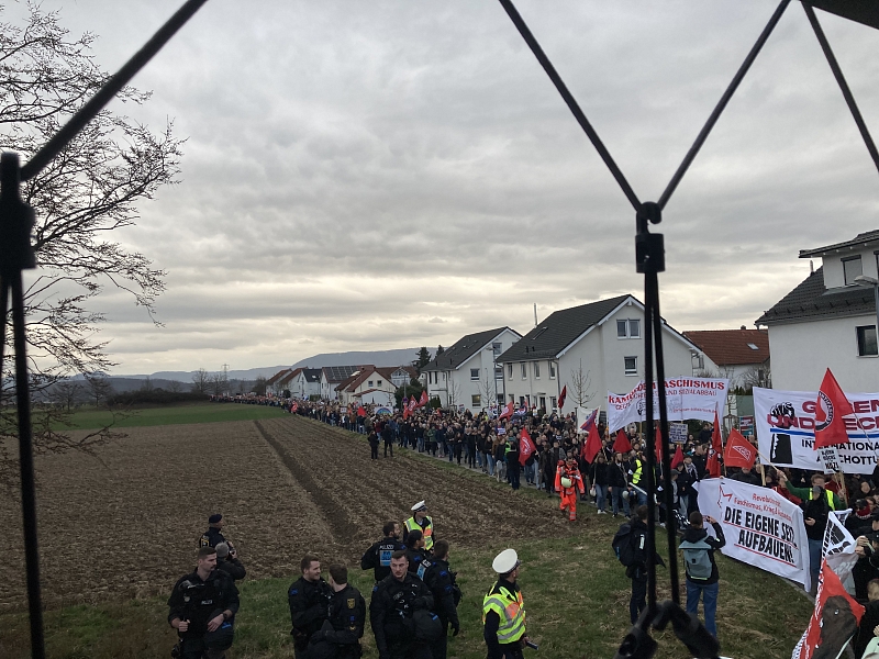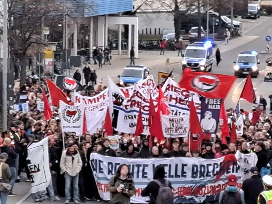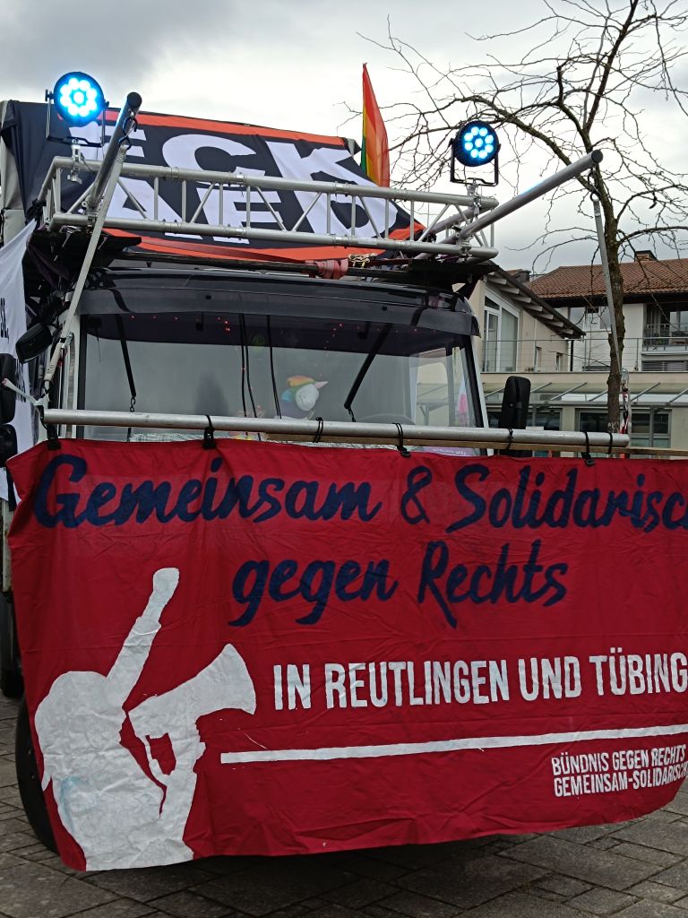 Der Veranstaltungsbeginn war auf 19 Uhr gesetzt, wurde aber durch die Gegendemo, wie erhofft, etwas verzögert. Bereits um 16 Uhr kamen die Gegendemonstrant:innen in Rommelsbach Mitte und nach ein paar Verzögerungen durch verspätete Zuge und Busse setzte sich ein antifaschistischer Schwall in Bewegung, angeführt von einem Lautiwagen (kurz für Lautsprecherwagen: eine mobile Anlage mit hoher Wattzahl). Kurz nach Beginn des Demozuges gab es bereits die erste Unterbrechung, denn ein paar gewaltbereite Faschisten hatten sich unter die Demonstrant:innen gemischt und waren bereit einen größeren Konflikt loszutreten. Das konnte jedoch unterbunden werden, und sie wurden polizeilich von der Demo weg eskortiert. Der weitere Verlauf der Demo war bis zur Wittumhalle ungestört. Vor Ort angekommen wurden vereinzelt Teilnehmer:innen der Demo von der Polizei rausgezogen, zeitweise bauten sich die Einsatzkräfte auch demonstrativ vor Teilen der Versammlung auf, was prompt als Einschüchterungsversuch eingeordnet wurde. Eine weitere Eskalation hat seitens der Polizei sowie seitens der Demo-Teilnehmer:innen nicht stattgefunden und die Kundgebung an der Wittumhalle verlief somit weitesgehend störungsfrei. Es gab Redebeiträge u.a. von der SOKO Reutlingen, dem OTFR Tübingen und dem Bündnis Gemeinsam und Solidarisch Gegen Rechts - Reutlingen und Tübingen. Angemeldet waren etwa 1000 Leute; zum jetzigen Zeitpunkt sind noch keine offiziellen Zahlen verfügbar, jedoch ist davon auszugehen, dass es deutlich mehr als tausend Menschen waren. Aktuelle Schätzungen belaufen sich auf 2000-4000 Demonstrant:innen. Von diesen waren einige auch einer symbolischen Lichterkette beteiligt.