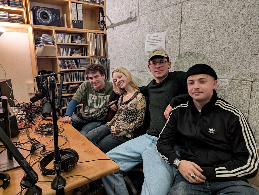 Diese Woche war die Band Blütenstaub bei uns zu Gast. Bestehend aus Jonathan (Gesang), Peter (Schlagzeug), Paul (Keyboard) und Frida (Bass) machen die vier Schüler seit 2024 gemeinsam Musik. Obwohl sie ihre Musik noch nicht veröffentlicht haben treten sie regelmäßig auf und spielen Konzerte.
