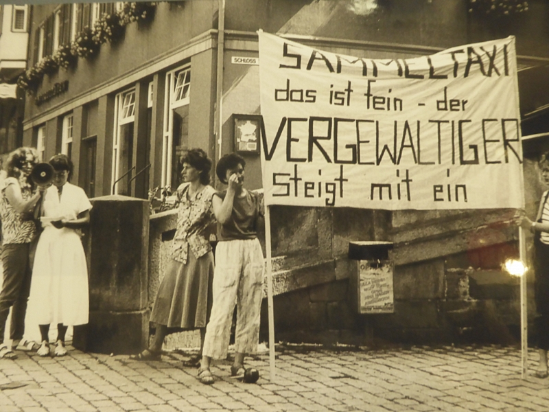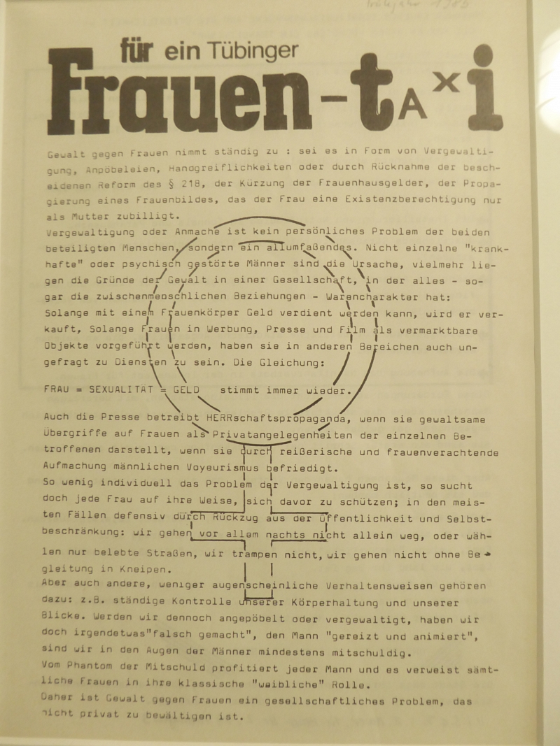 1983 gründete sich in Tübingen eine Initiative für ein Frauentaxi. Mit dem Frauentaxi sollten Frauen nachts sicher vor Angriffen und Belästigungen unterwegs sein. Die Initiative warb mit Flugblättern und Diavorträgen für das Taxi. Das Thema „Gewalt gegen Frauen“ kam dadurch an die Öffentlichkeit und wurde als Einschränkung der Frau und nicht mehr als Privatsache bekannt gemacht. Der Tübinger Gemeinderat führte jedoch kein Frauentaxi, sondern ein Sammeltaxi ein. Im Sammeltaxi können sowohl Frauen als auch Männer nachts nach Hause fahren. Mit Schildern wie „Sammeltaxi das ist fein-der Vergewaltiger steigt mit ein“ protestierten Frauen gegen das Sammeltaxi. Leider hatten die Proteste keinen Erfolg. Es wurde jedoch 1985 bundesweit das Nacht-Sammeltaxi eingerichtet. Daraufhin veranstalteten Frauen einen symbolischen Akt, bei dem das Frauentaxi feierlich mit einem Sarg durch die Stadt „zu Grabe getragen“ wurde.