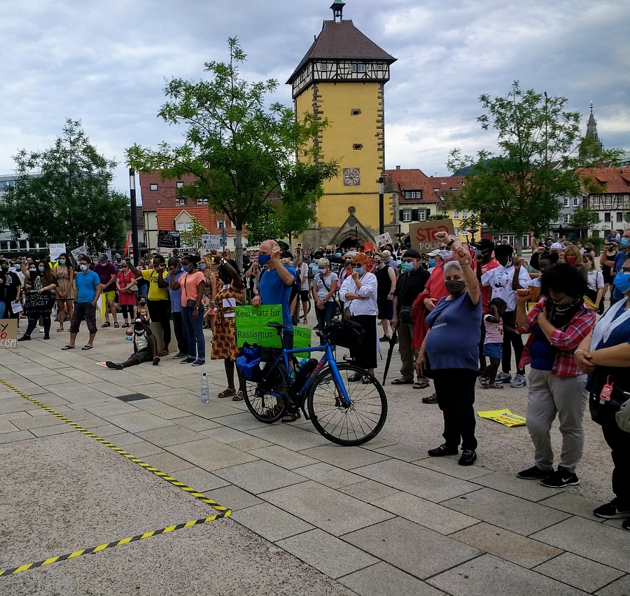 Am Samstag, den 27. Juni 2020 fanden sich etwa 200 Menschen vor der Reutlinger Stadthalle ein. Sie bekundeteten auf diese Weise Solidarität mit schwarzen Mitbürger*innen. Black Lives Matters Reutlingen hatte zu dieser Kundgebung aufgerufen. Schwarze Menschen standen auf der Bühne und erzählten ihre Geschichten.
