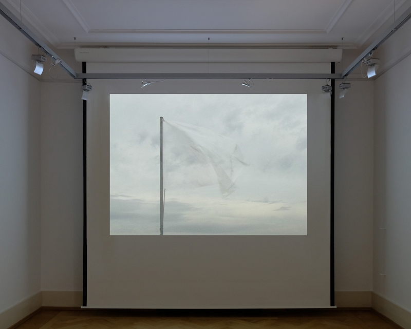 Im tonlosen Farbfilm "One second of silence" von Edith Dekyndt weht eine transparente Fahne vor Großstadthimmel über New York. Dekyndt, die in Ypres in Belgien geboren wurde und in Berlin lebt und arbeitet, thematisiert damit einen meditativen Raum, der über dem hektischen Treiben zu schweben scheint. Dort wirkt auch die herrschende zeitliche Dimension verschoben. Die 'entleerte Fahne' verschwimmt in ihrer Durchsichtigkeit dabei scheinbar mit dem Himmel. In dem 'Raum ohne Wände', der sich scheinbar unerreichbar und vermutlich unbeachtet über den Menschenmassen befindet, wirkt es auch so, als ob andere wesentliche Perspektiven normierter Sichtweisen aufgehoben wären: Fiktion und Wirklichkeit verschwimen im Spiel von Sichtbarkeit und Verborgenem, wenn sich Lichtreflexe auf dem transparenten Stoff spiegeln.