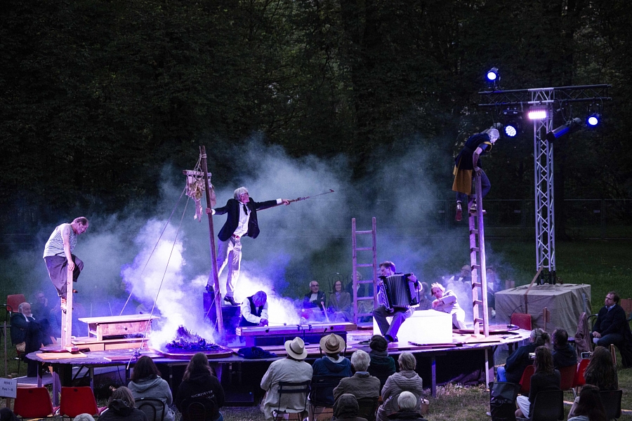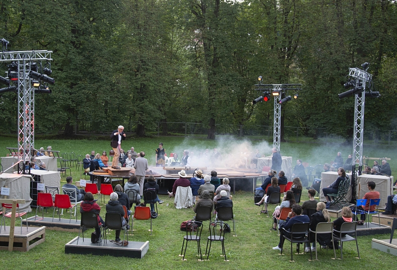 Das Stück wird auf einer großen Wiese zwischen der Kastanienallee und der Platanenallee aufgeführt. Vier Schauspieler*innen kommen an den riesigen Tisch zu einer Besprechung, um Lösungen zu finden. Lösungen auch zu aktuellen gesellschaftlichen Themen. Dabei soll Hölderlin ihnen helfen. Jeder von ihnen hat ein Buch von Hölderlin vor sich liegen. Die Zuschauer*innen sind um den Tisch herum platziert und so auch Teil der Versammlung. Musikalisch wird das Stück durch ein Monochord und ein Akkordeon begleitet.