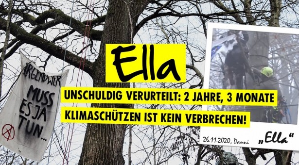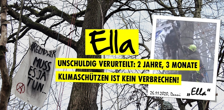 Ella wurde am 27.11.2020 im Dannenröder Wald aus den Bäumen geräumt und befindet sich seitdem in Untersuchungshaft. Sie soll mehrere gezielte Tritte gegen den kopf eines SEK-Beamten geführt und ihn dadurch in Lebensgefahr gebracht haben, in die Gefahr eines 15 Meter tiefen Absturzes. Daraus wurde Anklage wegen versuchtem Todschlags erhoben, die später jedoch fallen gelassen wurde.